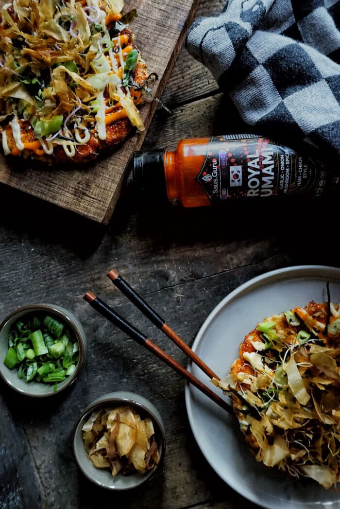 Begin met strepen maken van kewpie mayo gevolgd door de royal umami mayo. Verdeel nu de bos ui, nori, alfalfa en sesamzaadjes eroverheen. Als laatste leg je de Bonitovlokken erop. Door de warmte van de pannenkoeken zullen de vlokken gaan bewegen alsof ze leven.