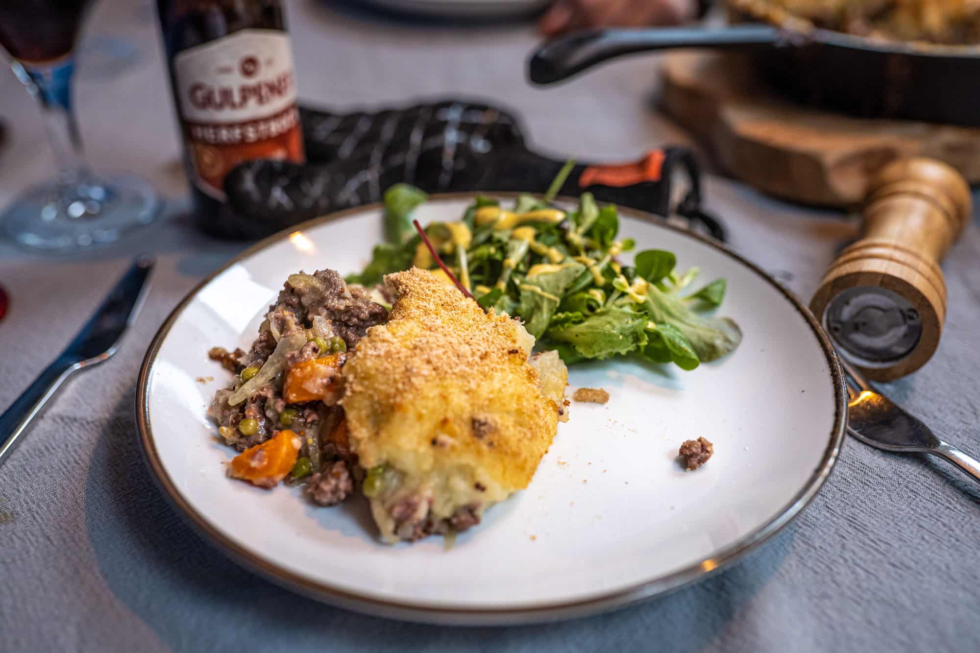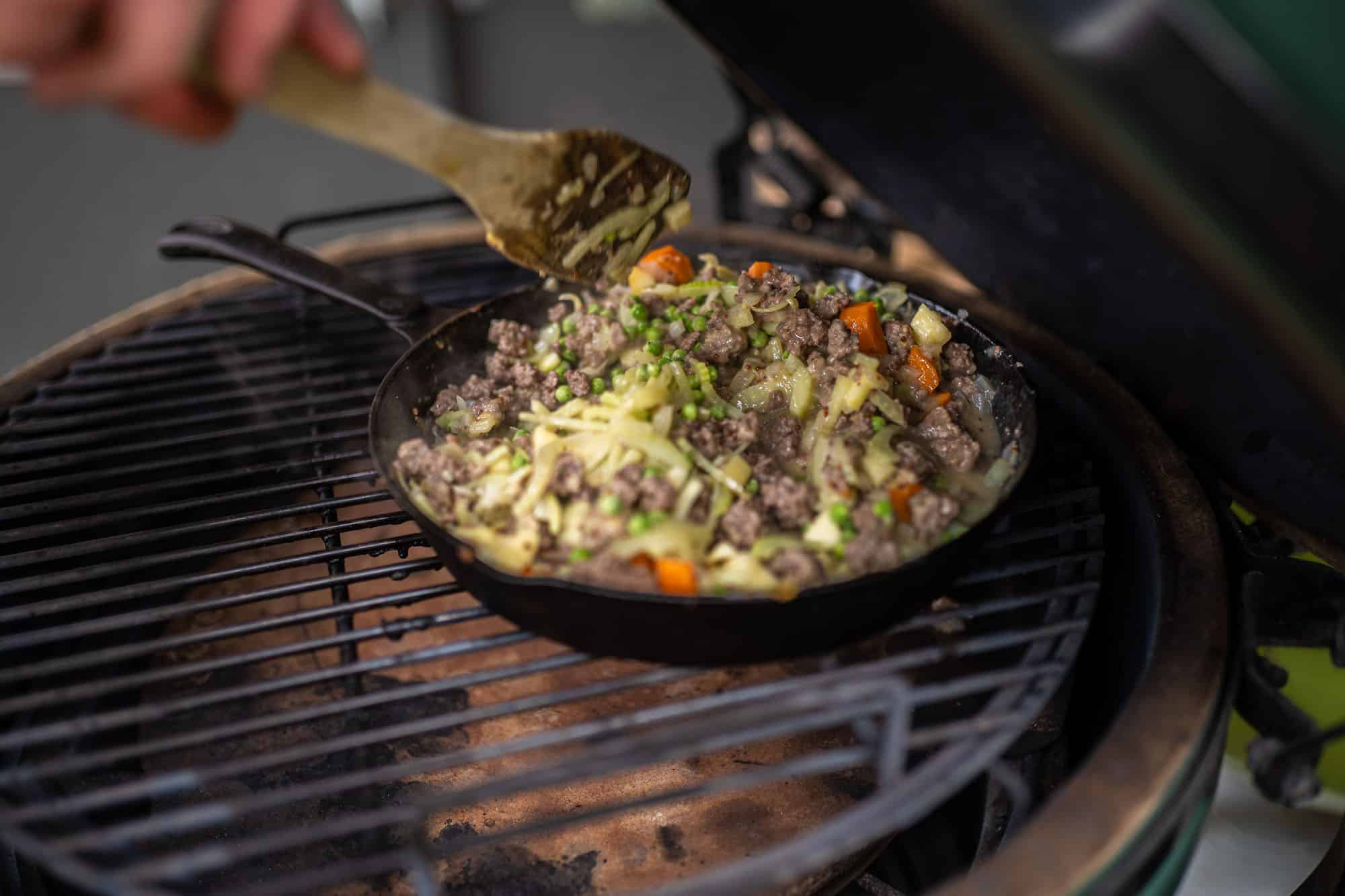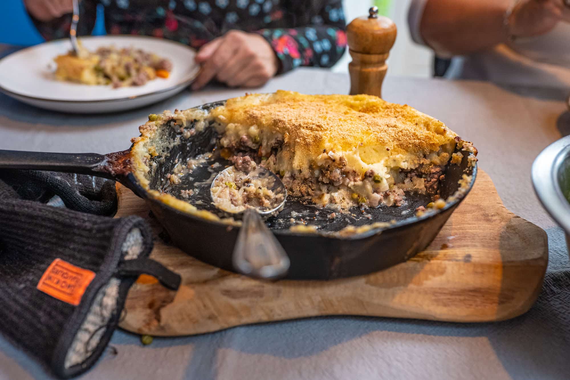 Plaats de skillet op het rvs rooster en bak de shepherds pie mooi gaar en lichtbruin. Na ongeveer 30 minuten bakken kun je de skillet op tafel serveren.