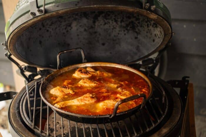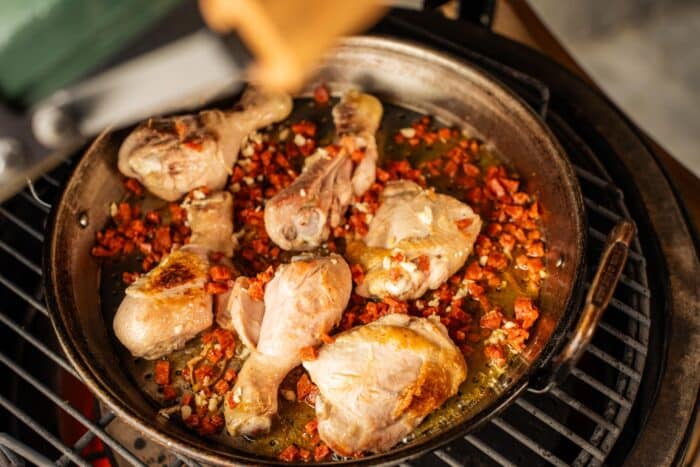 Zorg ervoor dat je BBQ goed is ingesteld voor indirecte warmte en verwarm deze tot 200°C. Terwijl de paellapan voorverwarmt, snijd je alle ingrediënten klein en zorg je dat alles klaar is om gebruikt te worden.