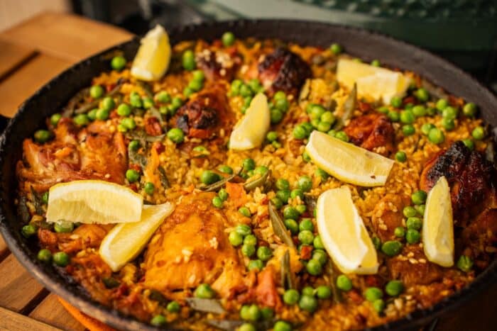 Controleer of de rijst al het vocht heeft opgenomen en een krokante korst aan de bodem heeft gevormd en haal de paella vervolgens uit de BBQ. Voeg de wedges citroen toe en laat de paella nog 10 minuten rusten onder een schone doek voordat je deze serveert.