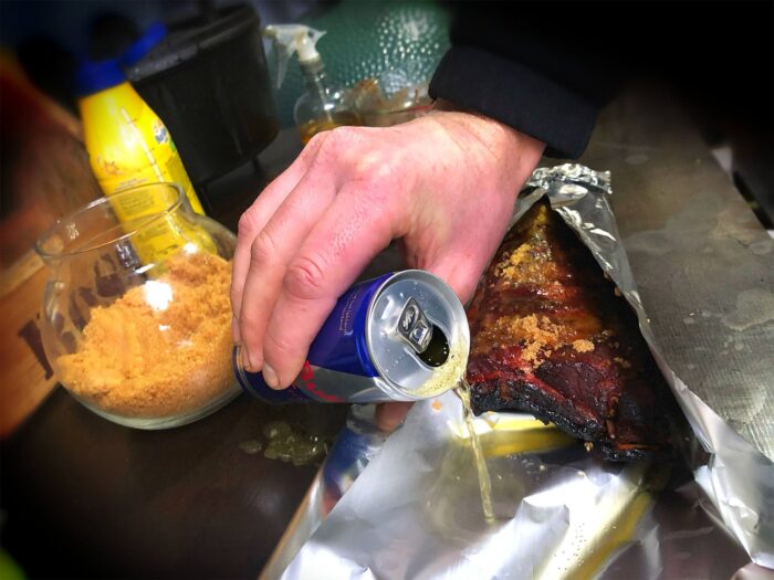 Tussen 2 en 3 uur dat de ribs er op liggen kun je testen hoe gaar ze zijn. Doe dit door je kerntemperatuur meter door het vlees te prikken. Gaat dit makkelijk, dan is het tijd om de ribs in te pakken in aluminiumfolie. Leg een rib op een ruim stuk folie, verdeel een eetlepel lichtbruine basterdsuiker over het vlees en schenk er een flinke scheut Red Bull bij. Vouw de folie dusdanig dicht dat er niets uit kan lekken of verdampen.