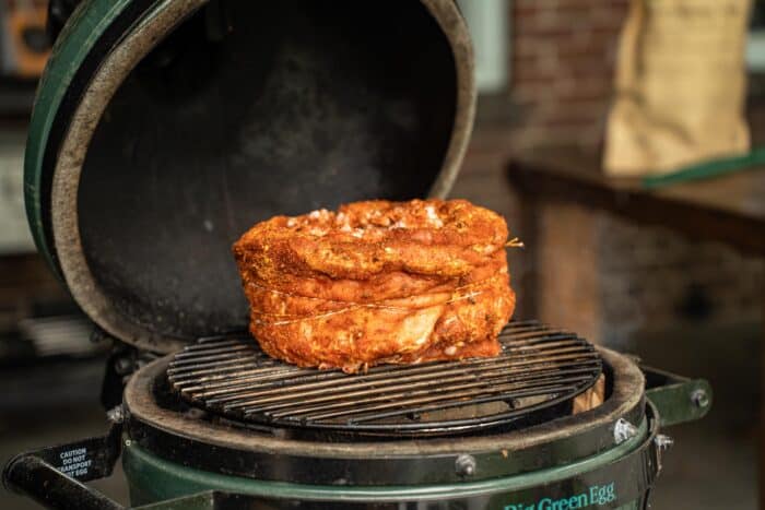 Je steek je Big Green Egg MiniMax of small formaat kamado aan en stel deze in op een temperatuur van 120 °C met een volledig indirecte opstelling. Je gebruikt hiervoor bijvoorbeeld een hitteschild. Je wacht tot de temperatuur stabiel is. Voordat je de spareribs op het rooster legt, plaats je een kleine chunk rookhout tussen de gloeiende kolen. Thomas gebruikt voor dit gerecht appel rookchunks maar hou je liever van wat stevigers dan zou je ook voor hickory rookchunks kunnen gaan. Daarna leg je de spareribs net buiten het midden op het rooster, boven het hitteschild. Door de hoogte van de rol kan het zijn dat hij de dome thermometer raakt als je deze exact in het midden zet. Vervolgens laat je de spareribs rustig low & slow garen op 120 °C. Reken op zo’n 2 tot 2,5 uur tot een kerntemperatuur van ongeveer 90 °C is bereikt. Je gebruikt hiervoor een kernthermometer om dit goed in de gaten te houden. Zodra ze de kern van 90 graden hebben bereikt ga je ze inlakken met de California Hot BBQ saus van Grate Goods. Dit doe je vervolgens ieder kwartier tot er een mooie laklaag ontstaat op de ribben.