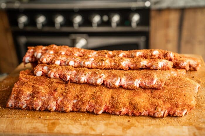 Je begint met het voorbereiden van de ribben. Vervolgens leg je ze op je snijplank en gebruik een stevig tafelmes om het vlies aan de achterkant te verwijderen. Dit zorgt ervoor dat de rub goed intrekt en de textuur lekker wordt bij het garen. Daarna kruid je de ribben royaal aan beide kanten in met de Spicy Chipotle Rub van GrateGoods. Deze rub geeft die lekkere balans tussen pit, rokerigheid en een vleugje zoet. Nu komt een leuk gedeelte: je rolt de spareribs strak op, alsof je een slakkenhuis maakt. Vervolgens bind je ze stevig vast met opbindtouw. Zo blijven ze mooi in vorm tijdens het garen én het ziet er indrukwekkend uit op het rooster.