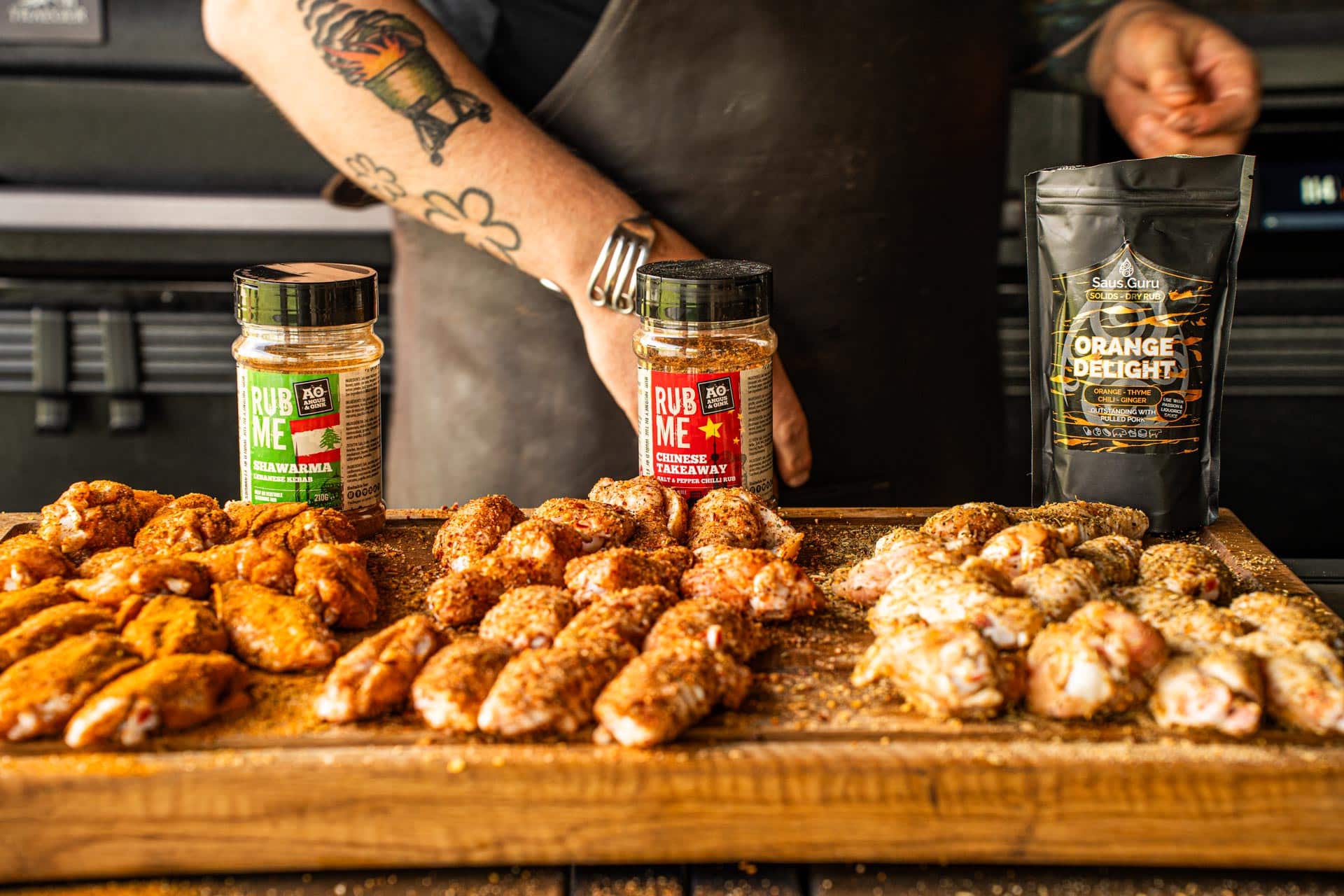 Als je de wings uit de koelkast hebt gehaald, laat ze dan een halfuur op temperatuur komen. Vervolgens bestrooi je de wings volledig met jouw rub naar keuze. Wij gaan voor de Chinese Take Away Rub. Zorg ervoor dat alle wings rondom bedekt zijn met de rub. Laat dit een aantal minuutjes intrekken.