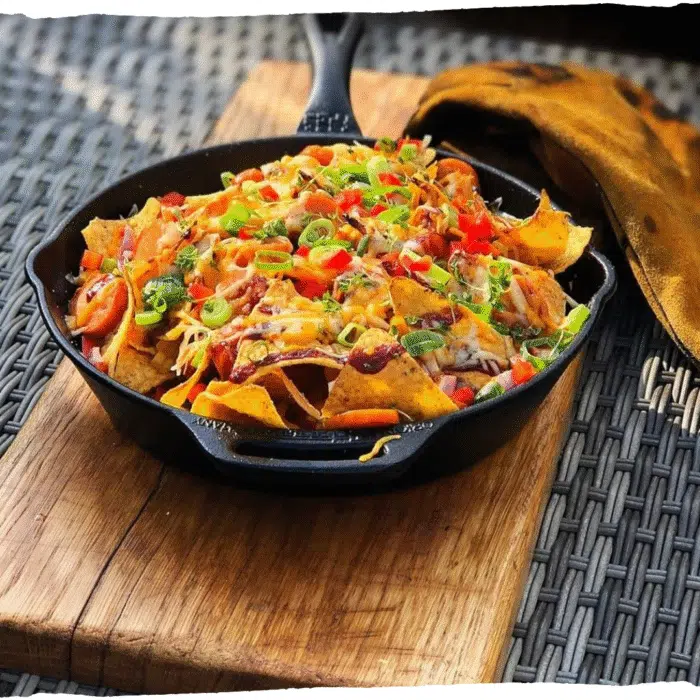 Dit is één van onze favorieten. Boordevol smaak, kleurrijk en origineel. Een rijk gevulde skillet met Doritos en worst als basis. Een heerlijke snack die je ‘s middags bij een borrel op tafel kunt zetten of als hoofdgerecht waarbij men ook rechtstreeks uit de pan mag pakken.