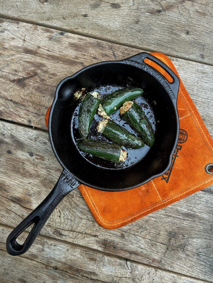 Neem nu een plakjes bacon en leg de pimentos erin Rol de bacon op en doe de vulling in de pimentos. Wanneer je alle pepers gevuld hebt bak ze gaar in de skillet.