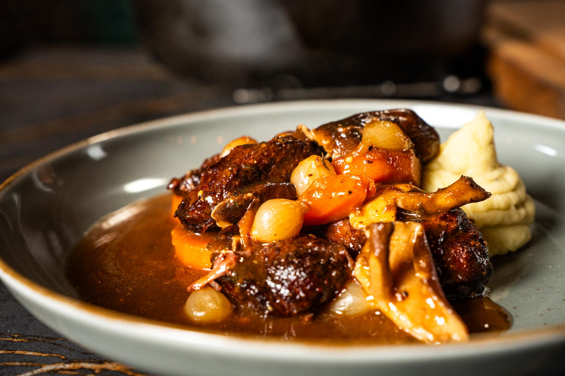 Fruit de zilveruitjes en de wortelen 5 minuten aan en voeg de varkenswangen toe met de peperkoek en vervolgens blus je het geheel af met De Dienstmeid van de Rijksontvanger 1 liter, dit laat je 1,5 sudderen. We gebruiken De Dienstmeid van de Rijksontvanger, fruitbier om zo het scherpe en zure erin te krijgen. Je kunt ook een donkerbier of een tripel gebruiken. Voeg ook wat blaadjes laurier toe en wanneer je ziet dat de stoofpot niet helemaal onder het vocht staat voeg je runderbouillon toe. En laat nog wat runderbouillon over voor als het geheel zich hard gaat afkoken kun je er altijd nog wat aan toevoegen. In de laatste 20 minuten voeg je de shiitake toe aan de stoofpot.