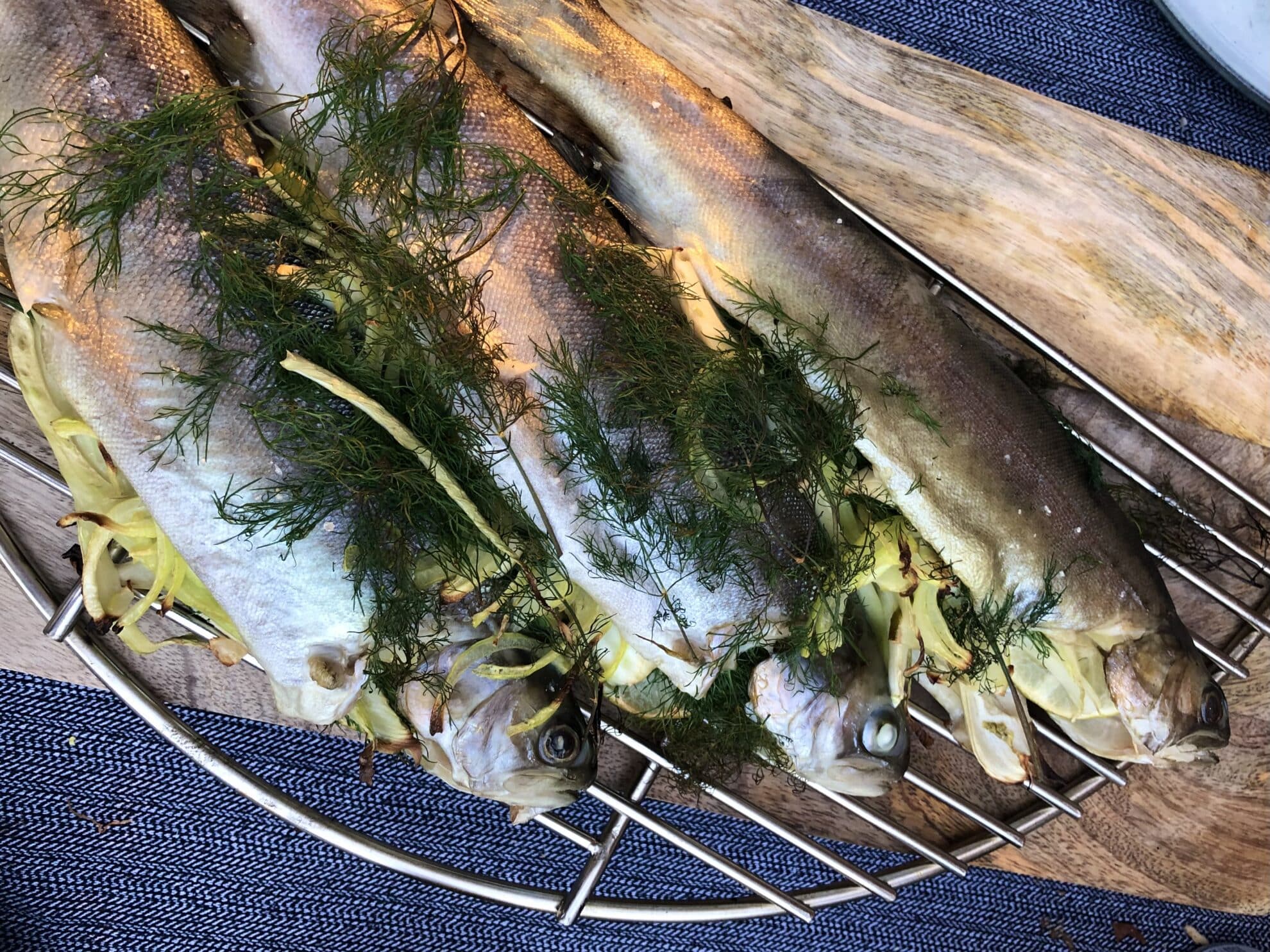 Haal de forellen van de barbecue en leg ze op een plank. Fileer de vis aan tafel. Dit doe je gemakkelijk door met een mes een inkeping te maken net achter de kieuwen en vervolgens met de bolletje kant van een lepel achter de inkeping over de graat te schuiven. Zo haal je perfect de filet van de graat af. Server elke gast een filet met wat van die heerlijke meegegaarde venkel/dille salade.