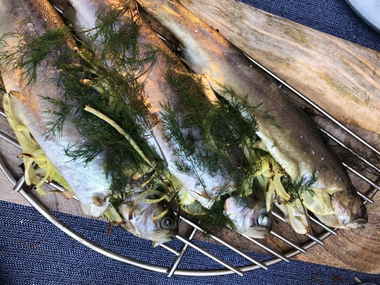 Rook de regenboogforellen ongeveer 25 tot 30 minuten óf tot je een kerntemperatuur van 63 oC tot 68 oC hebt bereikt.