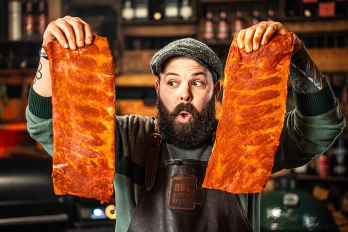 Zodra de tweede rub is ingetrokken, kunnen de ribben op de barbecue. Voordat ze erop gaan, leg je eerst 2-3 blokjes kersenhout tussen de gloeiende kolen. We gaan ze ongeveer 1,5 uur roken op 160 graden Celsius. Tijdens het roken spuiten we ze elke 30 minuten in met water, zodat er een mooiere ‘bark’ ontstaat. Dit kan met een marinade spray.