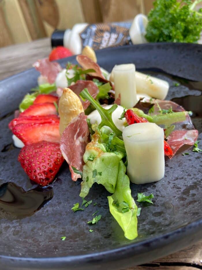 Begin met de salade op het bord te leggen. Zet hier nu tussen en langs stippen van de Cacio e Pepe saus. Snij de aarbei in plakjes of gewenste vorm en leg deze tussen de salade. Door de asperges in stukjes te snijden en recht op tussen de salade te zetten kun je speels hoogte creëren in je gerecht., steek nu de coppa die parma er tussen.