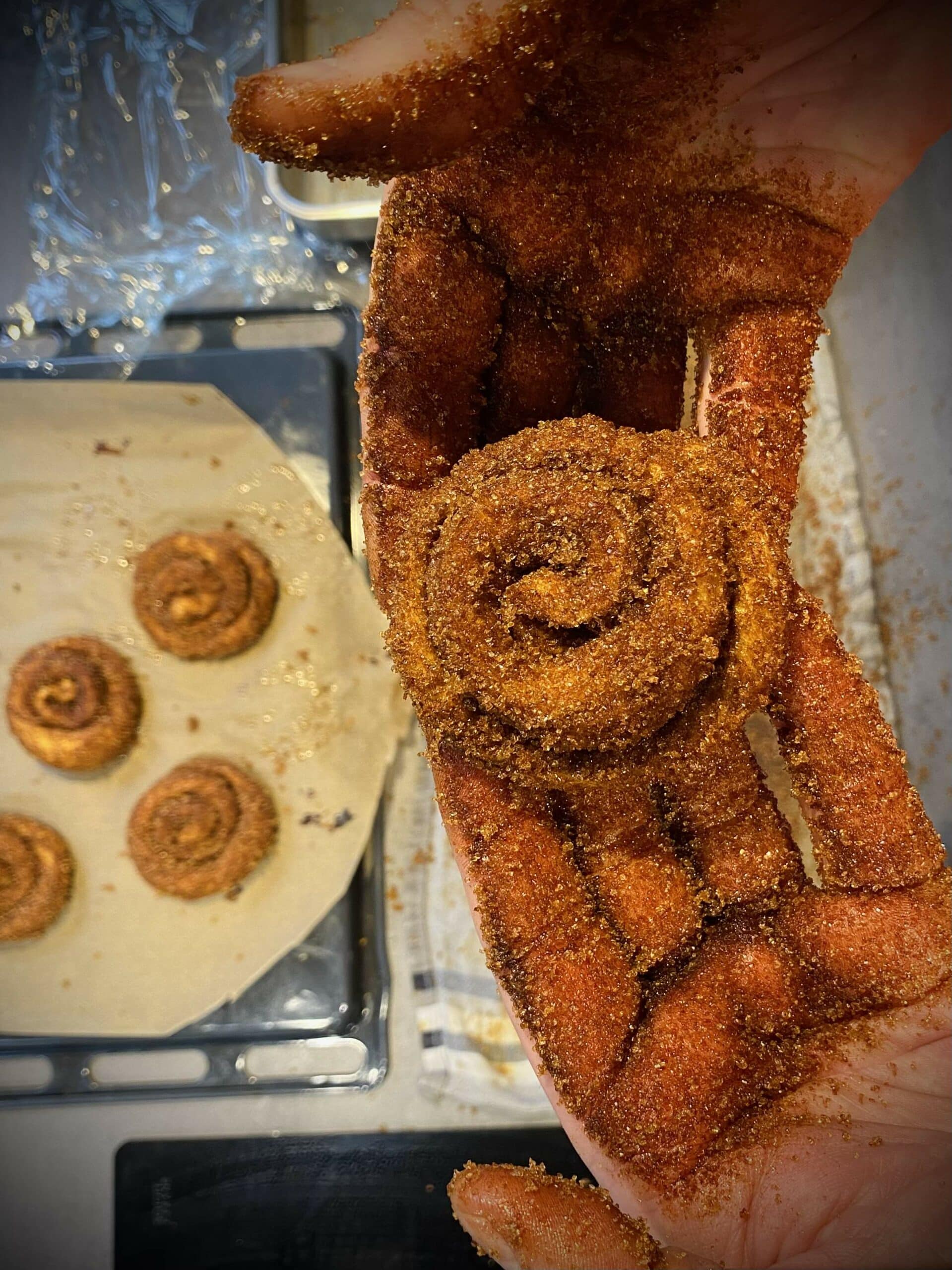 Nog enkele tips: Hou dus in eerste instantie een opening in het midden om hier het laatste stukje van de streng in te borgen. Zorg dat de bolus plat blijft. Na het komende uurtje rijzen zullen de bolussen bijna in volume verdubbelen.