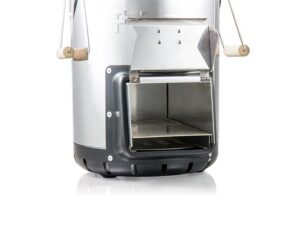 Je kan gemakkelijk hout, dennenappels en dergelijke plaatsen in de rocket stove via de onderste opening. Vanaf hier start het efficiënte verbrandingsproces. De warmte wordt beperkt tot een kleine ruimte die wordt beschermd door het geïsoleerde lichaam. De warmte die uit de ventilatieopening ontsnapt, kan dan opgeborgen en gebruikt worden om te koken in het gietijzeren blad.