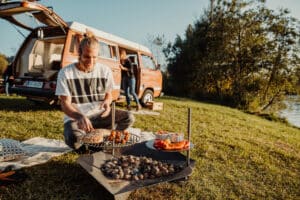 Het rooster voor de Triple vuurschaal van Höfats is gemaakt van zilveren RVS.
