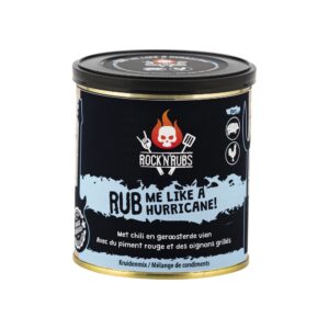 De ingrediënten van Rock ‘n’ Rubs – Rub me like a hurricane zijn rietsuiker, chili 6%, zeezout, uien 10%, paprikapoeder, zwarte peper, gerookte paprika.