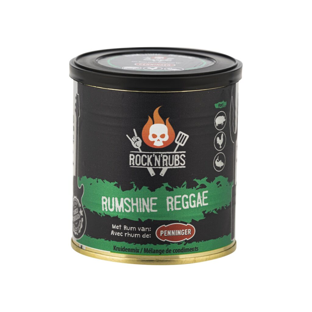 Rock ‘n’ Rubs – Rumshine Reggae bestaat uit zeezout, kruiden zoals koranderbladen, peterselie, marjolein, thijm, rietsuiker, specerijen zoals chili, gember, Spaanse peper, zwarte peper, nootmuskaat, kaneel, knoflook, ui en 6,5% rum.