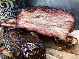 Short ribs zijn heerlijke ribben. Het vlees heeft een hele volle smaak en een langzame garing nodig. Houd een temperatuur van 105 graden aan en rook de ribben eerst 3 uur. Pak ze vervolgens in butcher paper met een scheutje appelsap, bier of wijn en laat langzaam garen tot een kerntemperatuur van 92-95 graden.