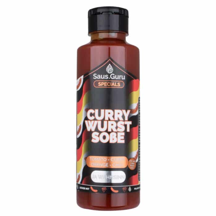 Een verpakking Saus.Guru Currywurst Soße 500ml bevat 500 milliliter saus.