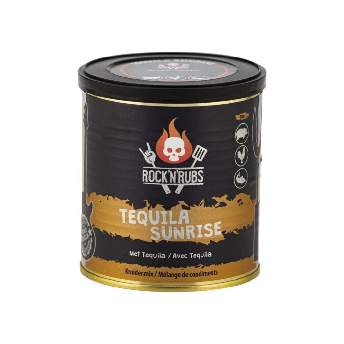 Rock ‘n’ Rubs – Tequila sunrise bevat specerijen zoals zoete paprika, koriander, zwarte peper, witte peper, chili, komijn en Spaanse peper. Daarnaast bevat het zeezout, rietsuiker, uien, Tequila, kruiden zoals oregano, rozemarijn, basilicum, knoflook en sinaasappelschil olie.