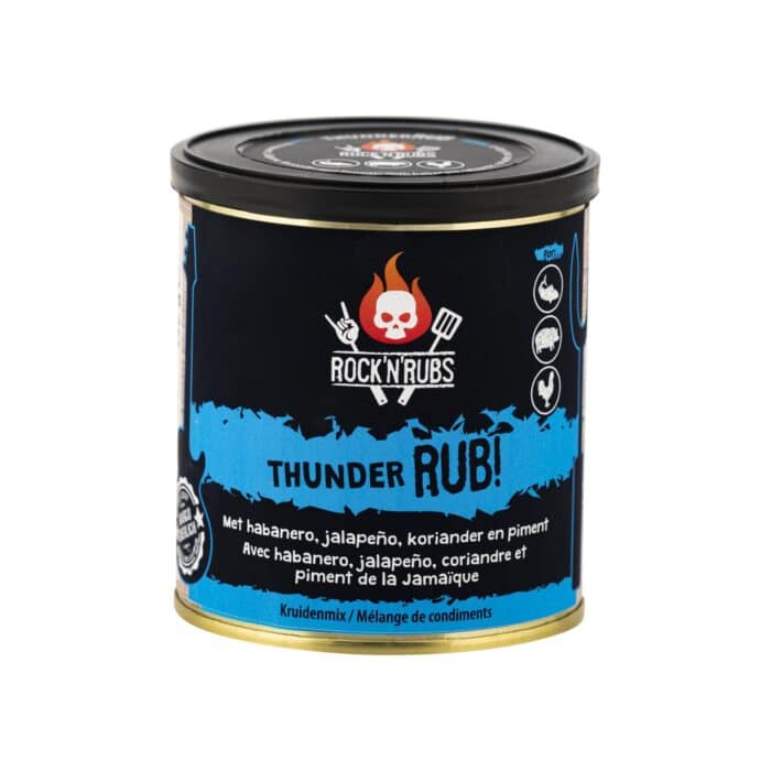 De Rock ‘n’ Rubs – Thunder rub bevat specerijen zoals gemalen piment, paprikapoeder, knoflookpoeder, zwarte peper, witte peper, gemalen chili, gemalen korianderzaad, jalapeño granulaat, gemalen habanero, rietsuiker, zeezout, uien, en kruiden zoals oregano en rozemarijn.