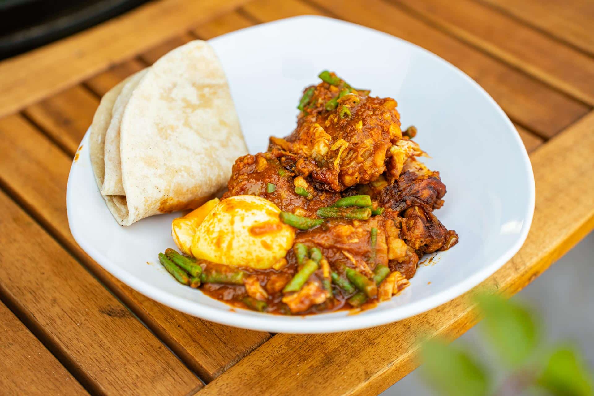 Zodra het geheel begint te pruttelen, bouw je de BBQ-opstelling om naar een volledig indirecte opstelling. Laat de roti rustig stoven tot de kippenbillen gaar zijn en de aardappel zacht zijn. Na een uur voeg je de kousenband toe. Laat deze nog 30 minuten meekoken. Reken op ongeveer 1,5 uur sudderen. Zo kunnen ook alle smaken goed intrekken. Als de kip helemaal gaar is, haal je het vlees van de botten en meng je het terug in de saus. Leg als laatste per persoon een gekookt eitje in de pan om nog even mee te warmen.