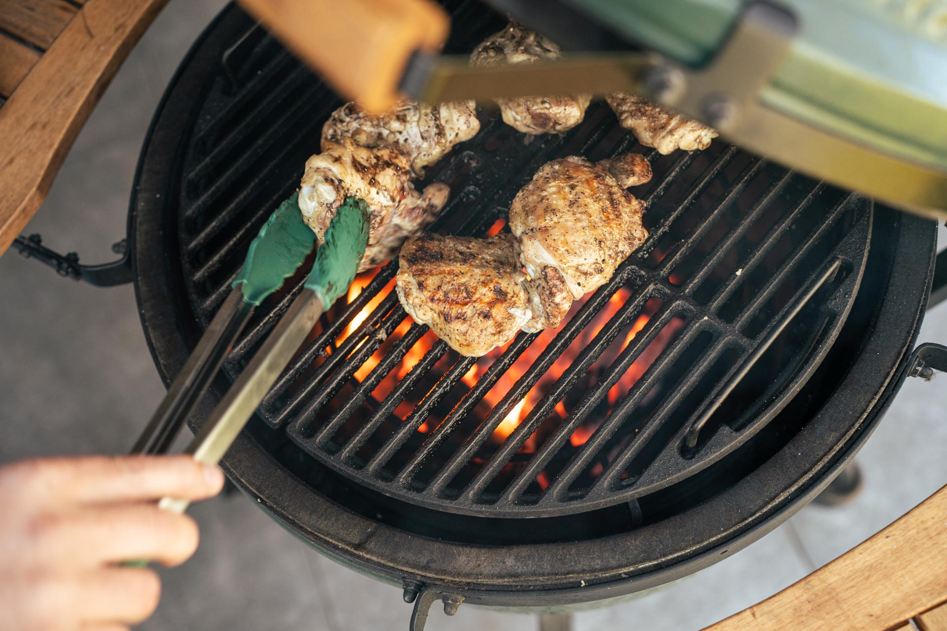 Wij maken de roti met kippenbillen, maar het kan ook met kippendijen. Het vel en been blijft aan het vlees. Dat geeft tijdens het stoven meer smaak. Geef de kip rondom zout en peper. Stook de BBQ op 220°C en grill de kip rondom tot hij een mooi kleurtje en korstje heeft. Het hoeft nog niet gaar; je bouwt hier vooral die eerste laag smaak op. Haal de kip eraf en zet de Dutch oven op de BBQ om voor te verwarmen.